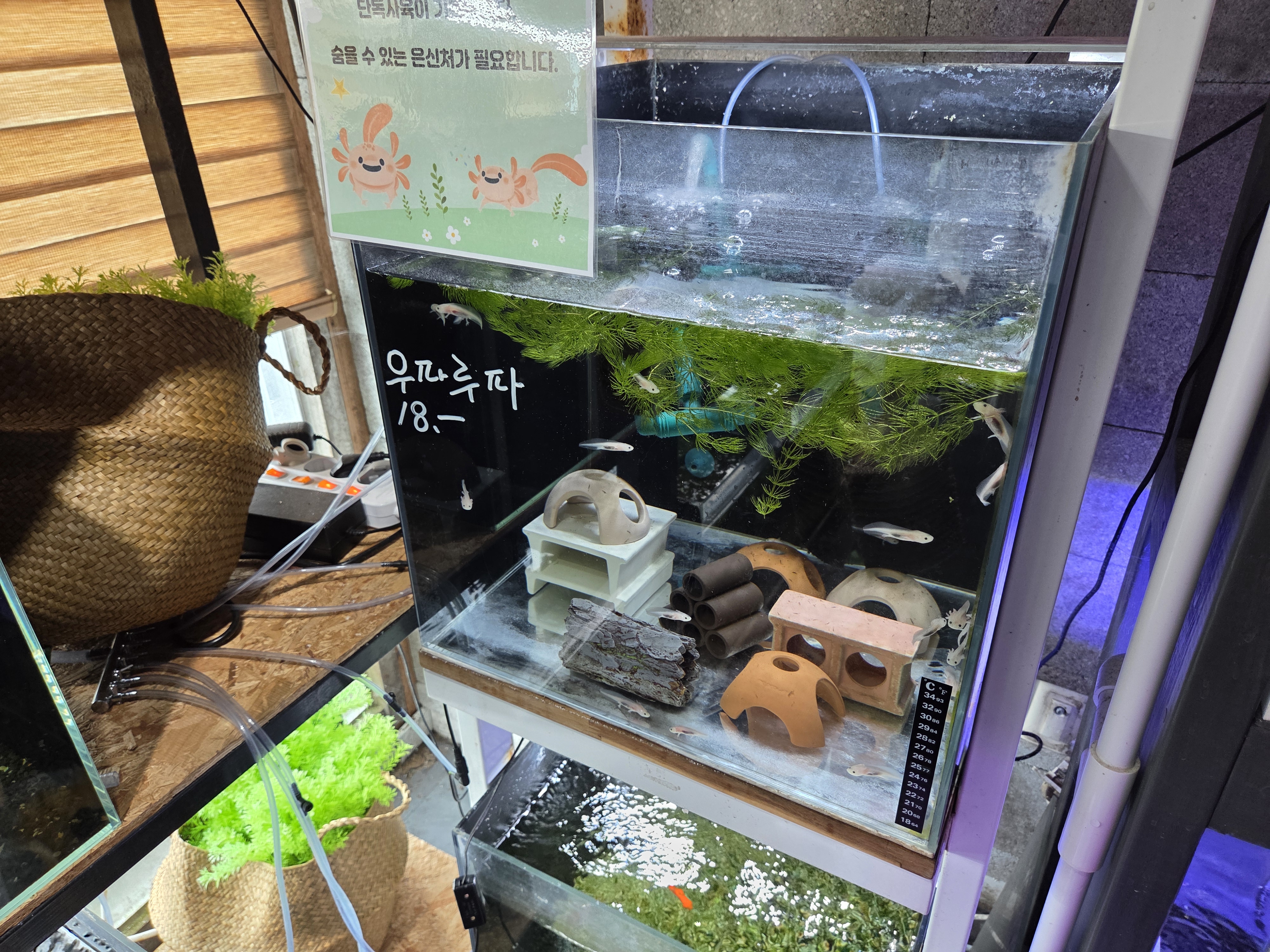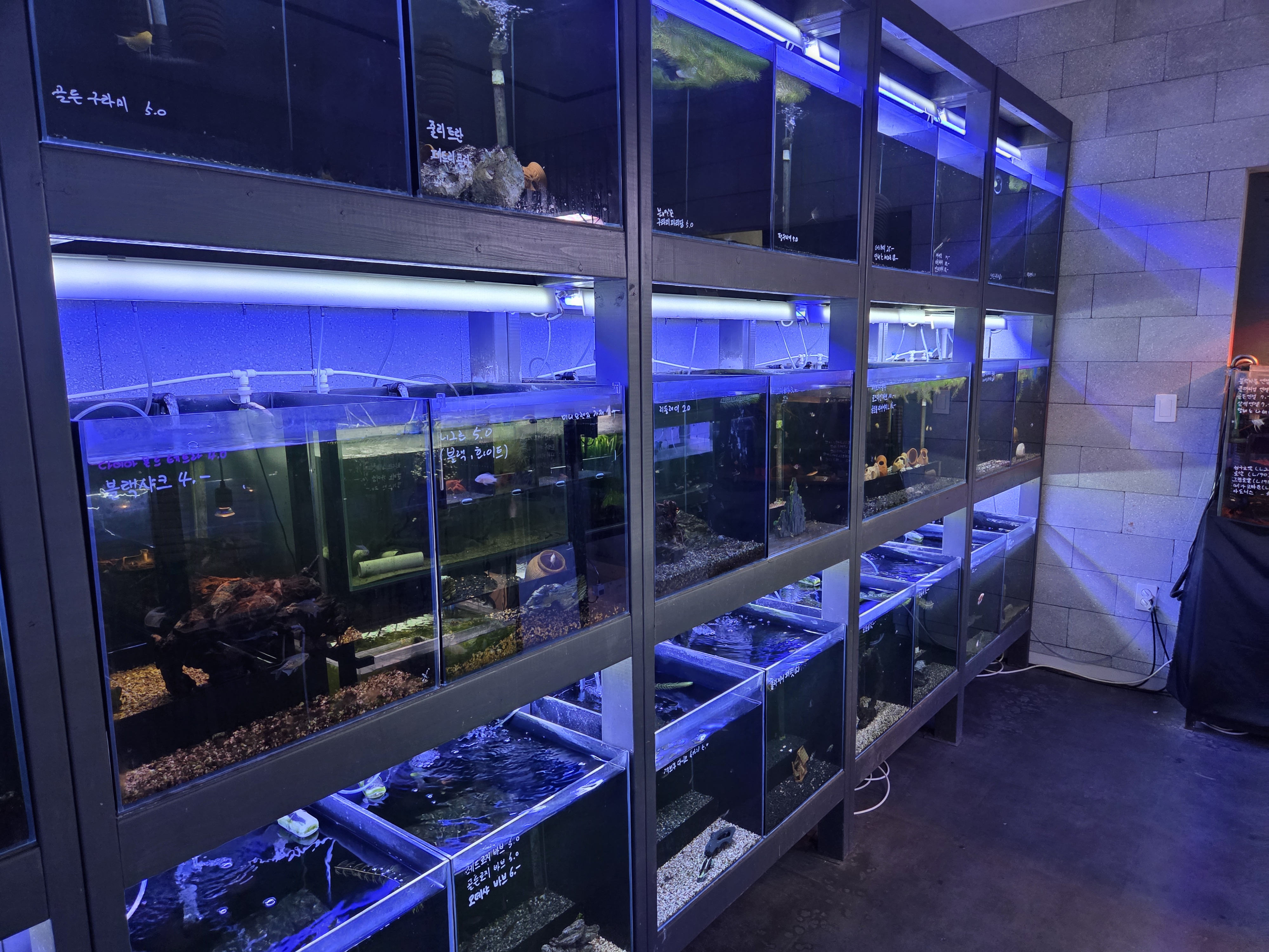 들어서자마자 반짝이는 수조와 은은한 조명, 그리고 잔잔한 음악이 어우러진 공간이 펼쳐져요.