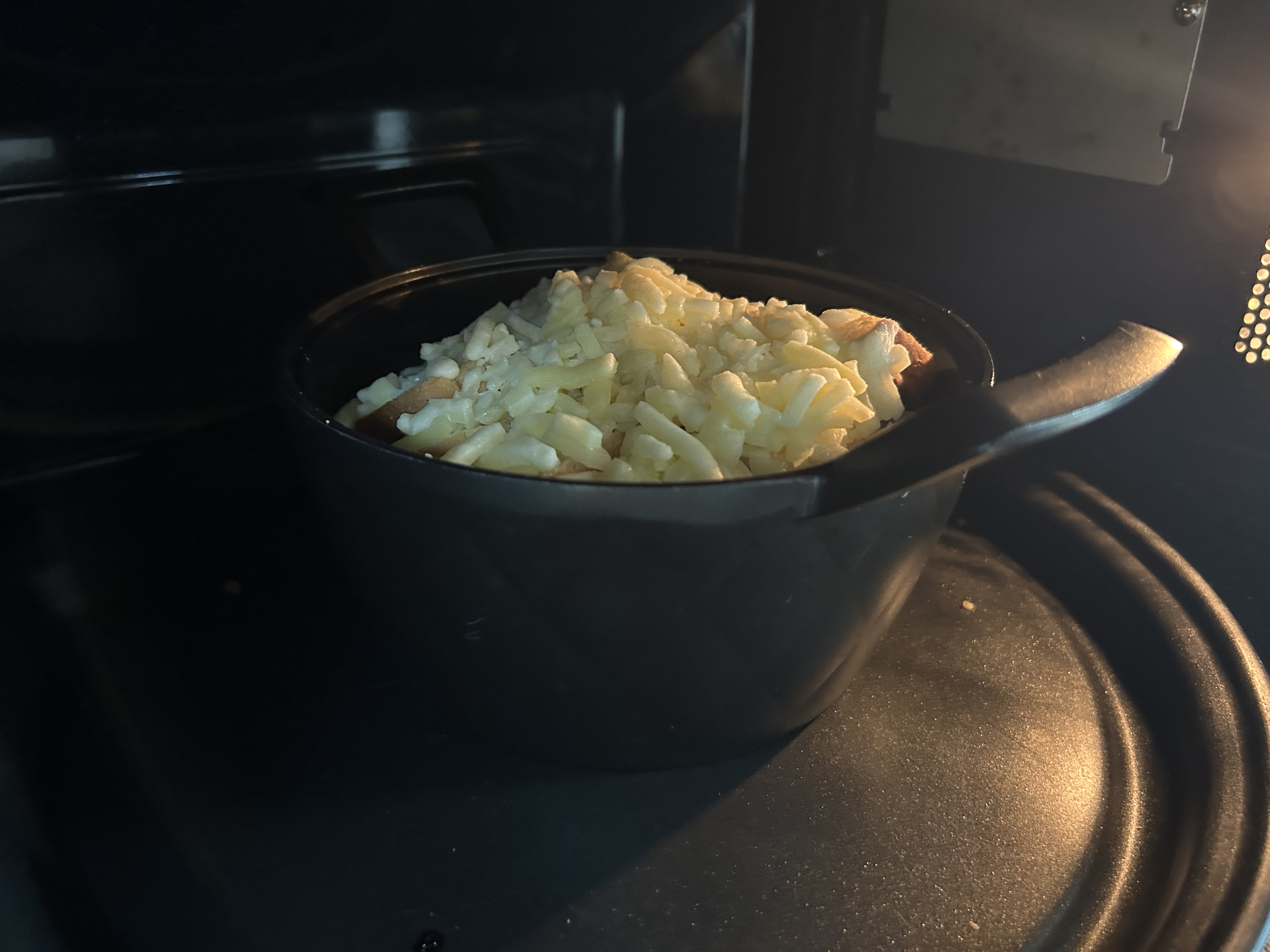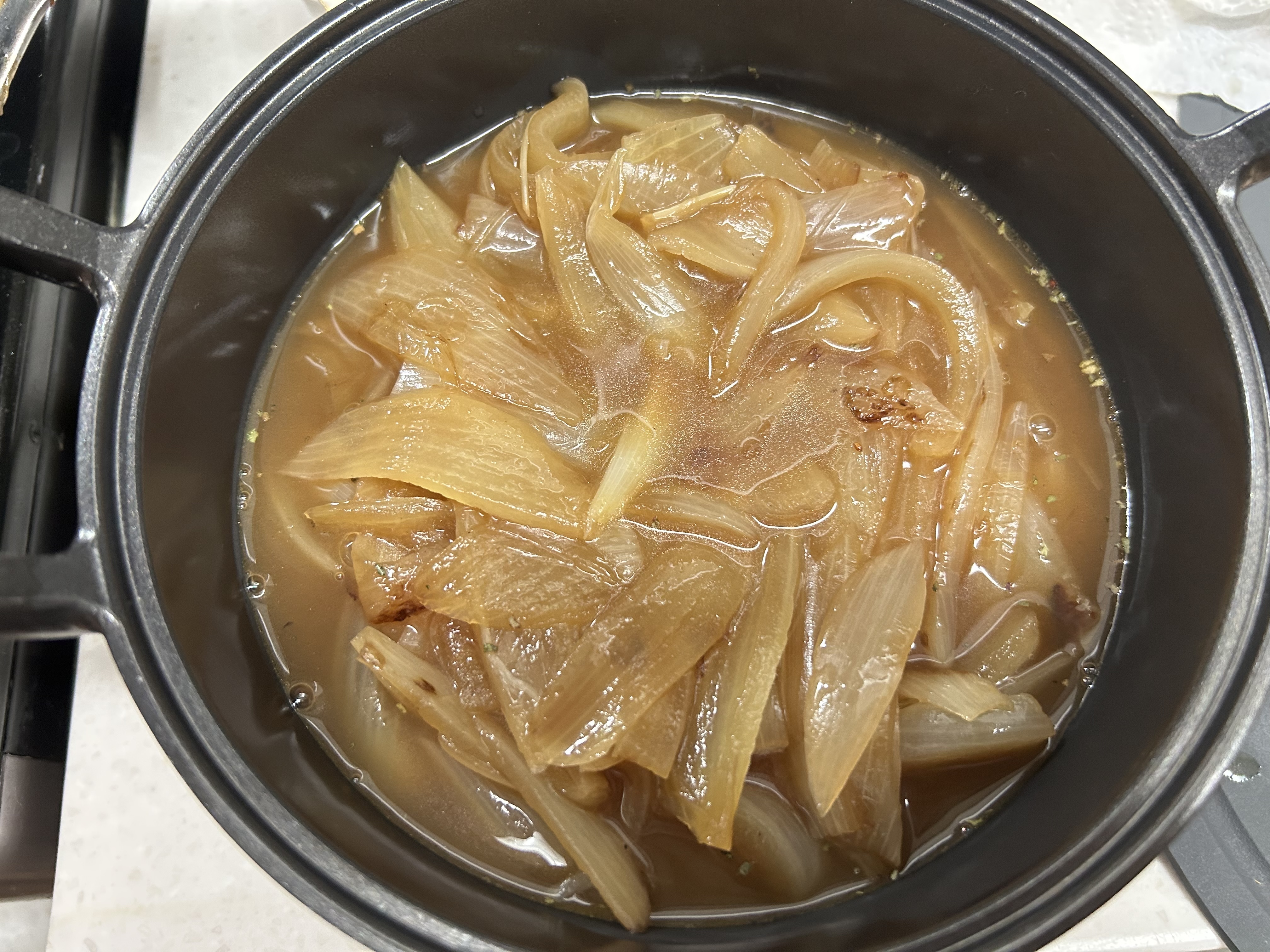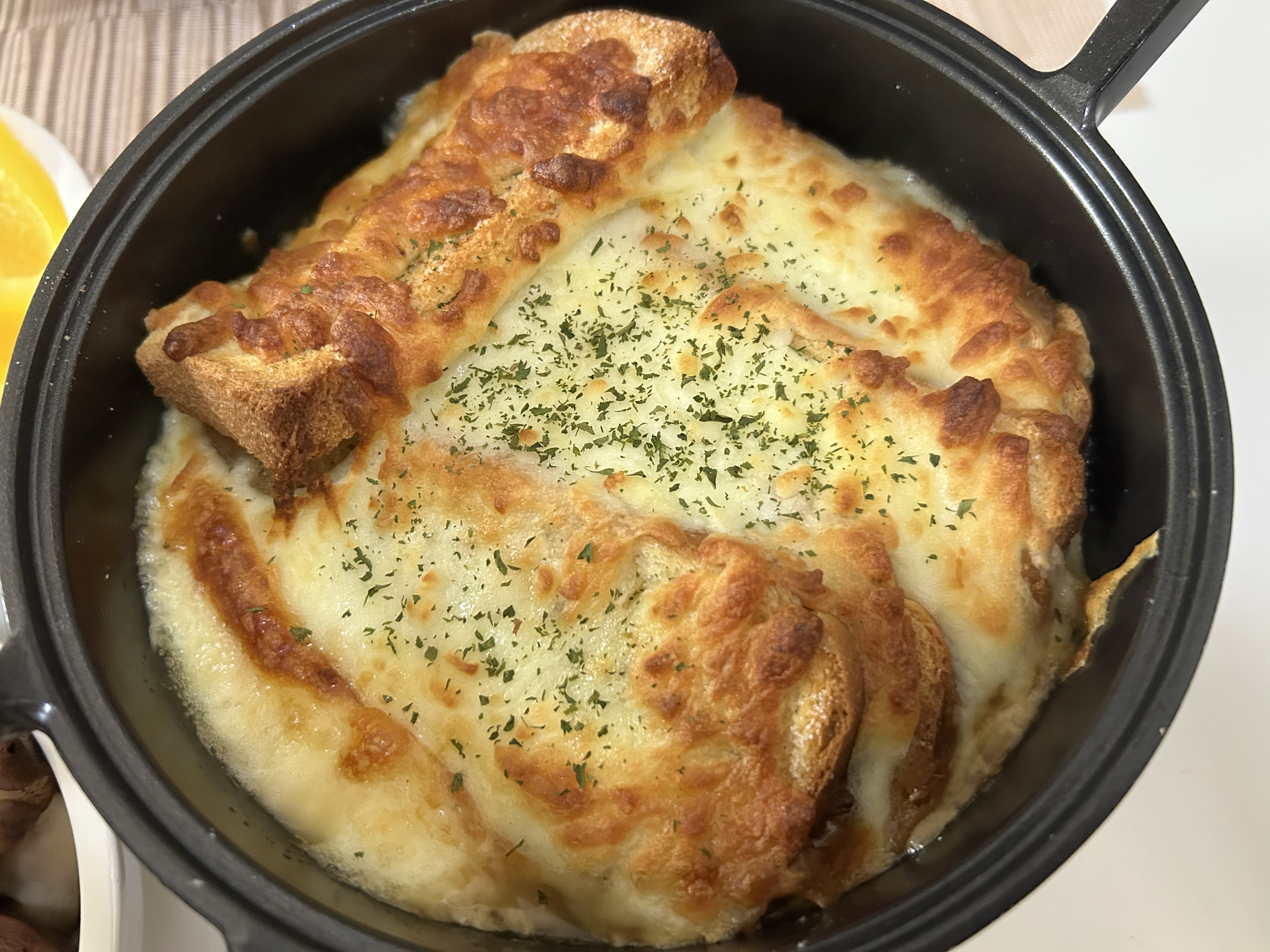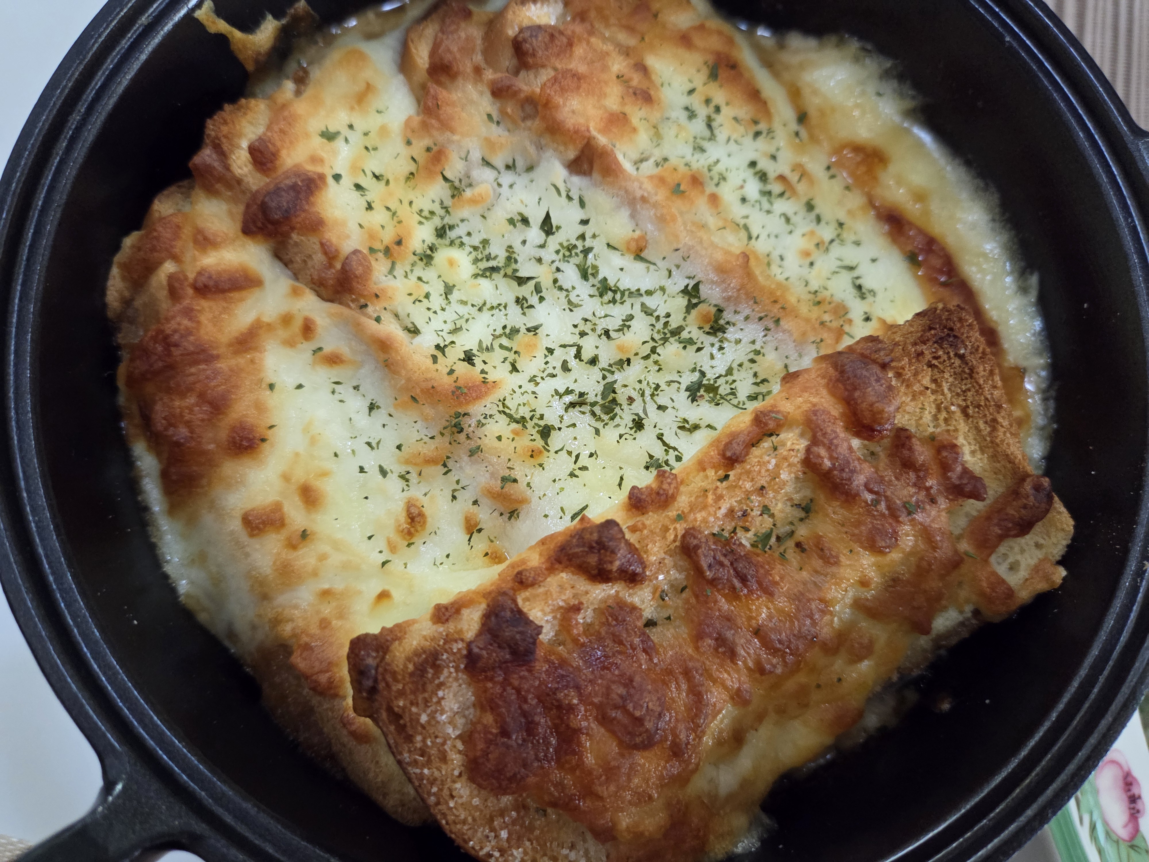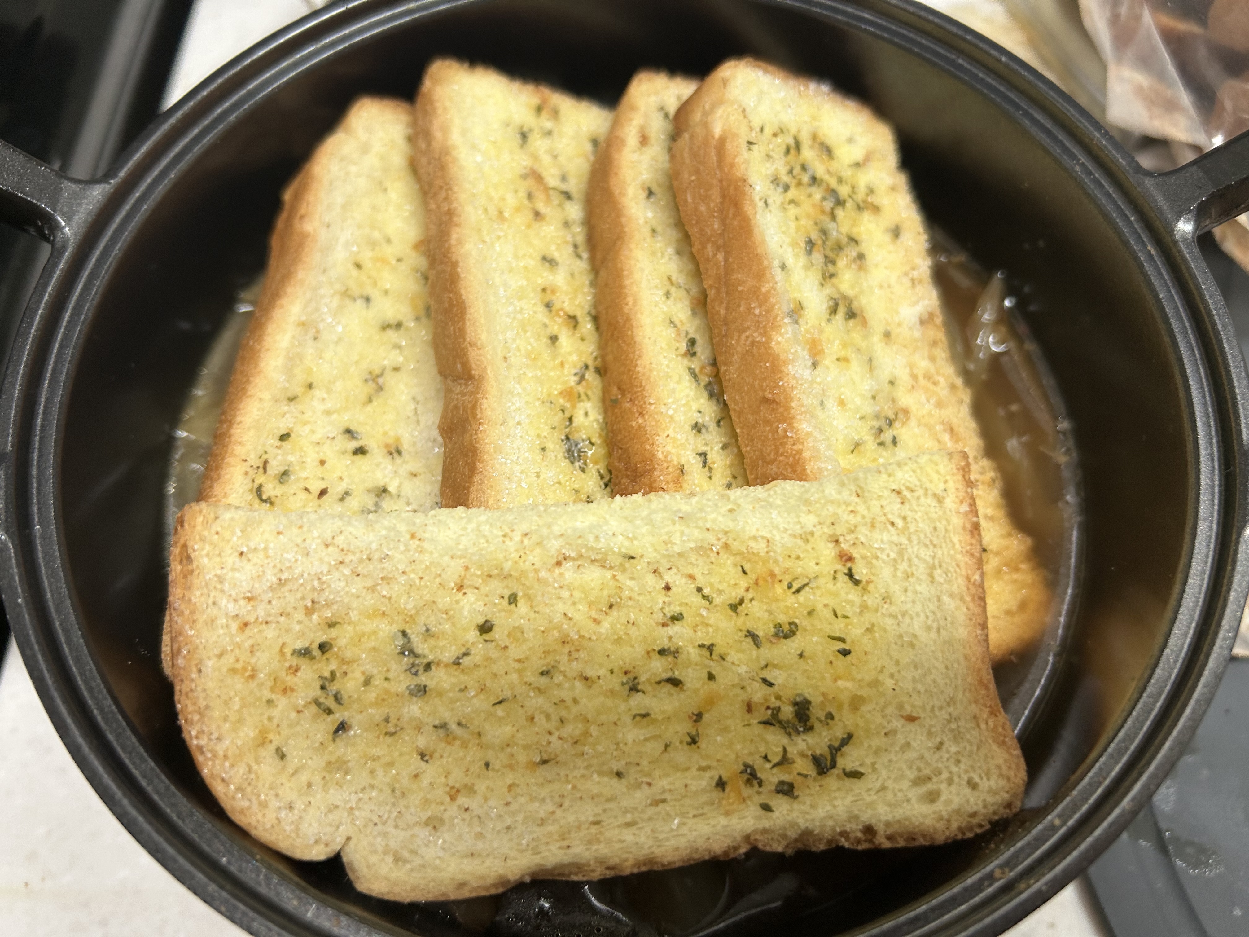 9. 졸여진 양파물에 위에 마늘빵과 모짜렐라 치즈를 올려줍니다.